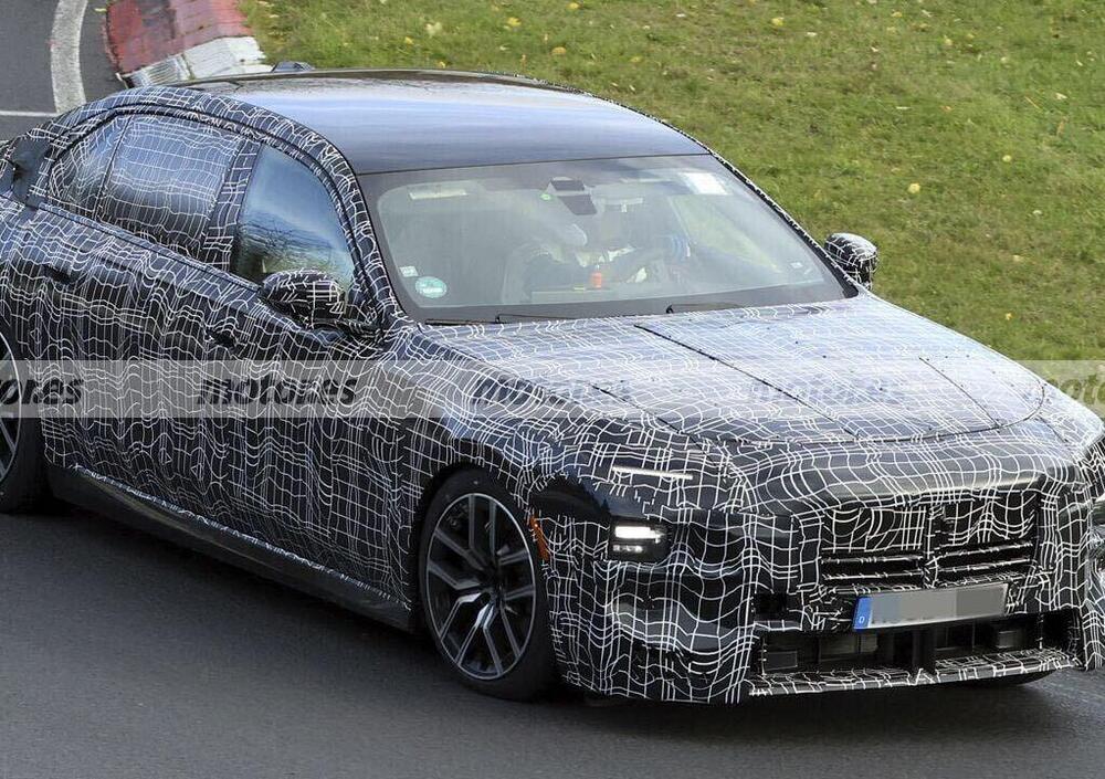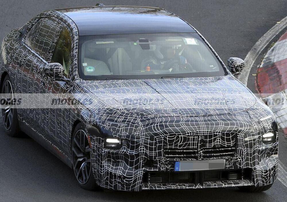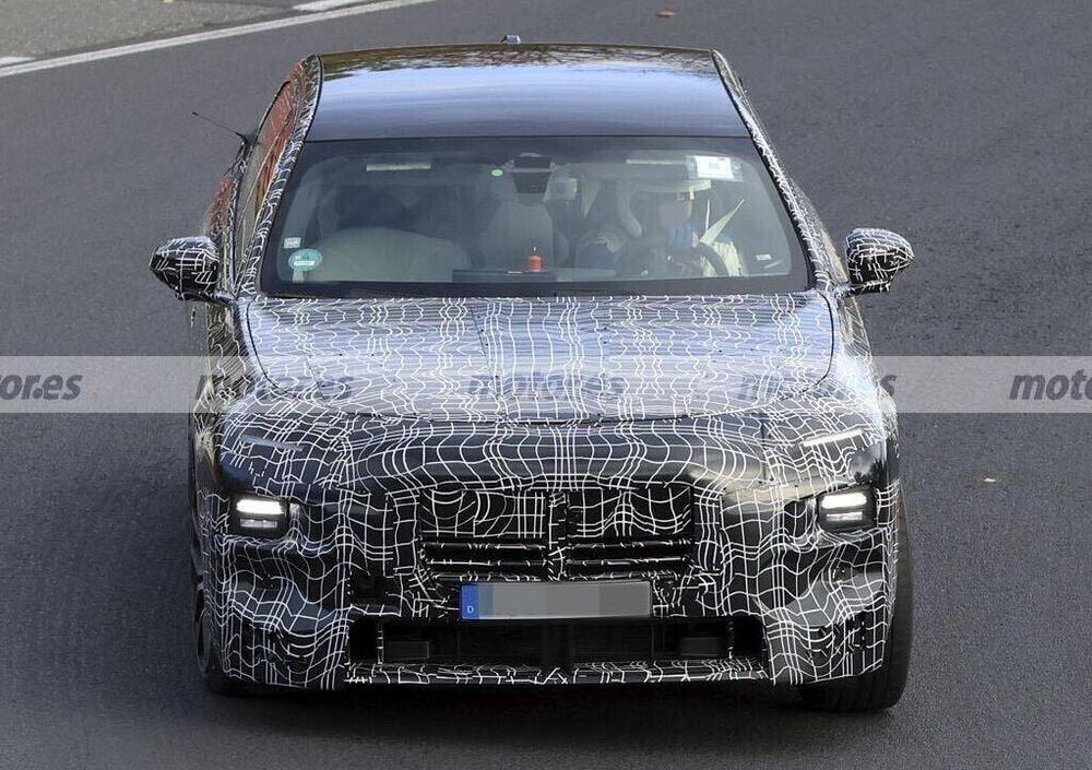 Sotto il pesante camouflage si nasconde una BMW Serie 7 più audace e sportiva che mai. Il frontale, con fari compatti e taglienti, segna una netta evoluzione stilistica rispetto all’attuale generazione. La griglia ovale mantiene il suo carattere distintivo, ma adotta una parte superiore chiusa che ospita i sensori per la guida assistita e una telecamera frontale integrata, mentre il paraurti rivela un’ampia presa d’aria centrale e linee più scolpite, ispirate ai modelli BMW M. Anche le ruote da 20 pollici e gli scarichi sportivi fanno intuire che questa non è una semplice berlina di rappresentanza, ma una gran turismo a tutti gli effetti.