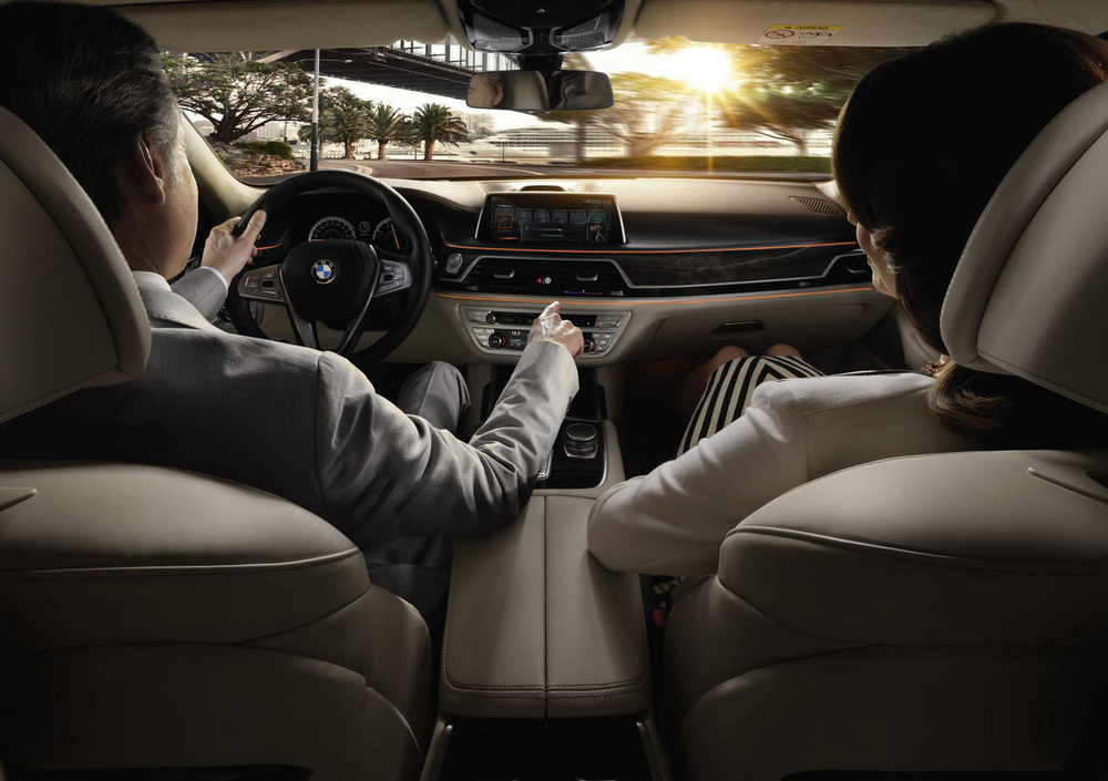 Passando sotto il profilo dell'infotainment, numerose sono state le migliorie per incrementare i già elevatissimi standard della BMW Serie 7. Uno schermo di dimensioni generose, posizionato al centro della plancia, sarà touch-screen, permettendoci di controllare direttamente le funzionalità dell'iDrive senza necessariamente ricorrere all'utilizzo del celeberrimo controller. Ricercata la tecnologia di un innovativo sensore 3D, il quale capterà i movimenti della mano ancor prima che essa sfiori lo schermo. Presente nel pacchetto Executive Lounge, troviamo un climatizzatore automatico quadri-zona, sedili posteriori singoli con funzionalità. Per chi volesse un comfort ancora più spiccato, esiste l'Executive Lounge Seating – un sedile dotato di poggiapiedi posto dietro al passeggero anteriore – una consolle centrale ed un tablet da ben 7” in grado di comandare l'infotainment.