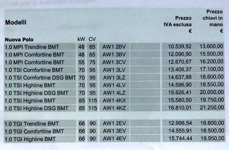 Ecco quindi le rate della prima offerta prevista per il mercato italiano: sono a partire da 129 euro mensili per la Trendline 1.0 65CV, fino a 169 euro per la Highline TGI 90CV. L’anticipo medio è tra i 1800 e i 3200 euro, mentre il valore futuro garantito al termine dovrebbe poi oscillare tra 53 e 55% del prezzo a nuovo.