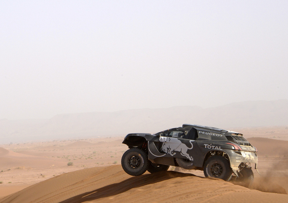 Al Campo di Zagora erano già tutti pronti per ripartire con la festa, ma non tutto è andato benissimo. Sébastien Loeb, deciso a migliorare il sesto posto della vigilia, forse esagera un filo con l’irruenza. Prima mette su un fianco la 2008 DKR “Original”, quella che ha debuttato alla Dakar 2015 e, evoluta, ha vinto al Silk Road Rally, e a 15 chilometri dall’arrivo si “migliora”, questa volta mettendo la Macchina sul tetto. Lavoro per i Meccanici, e una nuova sosta extra nel deserto in attesa di essere recuperato. Esperienza che cresce!