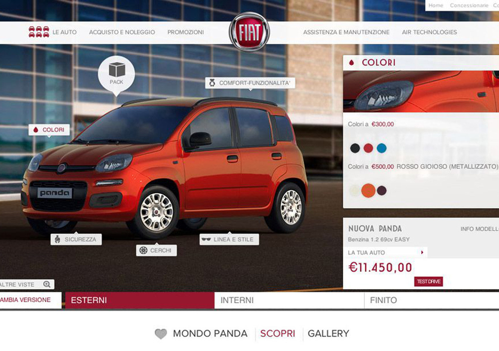 Le auto e i servizi Fiat sono presentati in successivi livelli di approfondimento e se durante la navigazione si è interessati a un particolare componente o accessorio, con un semplice clic lo si può ritrovare automaticamente inserito nella propria configurazione.