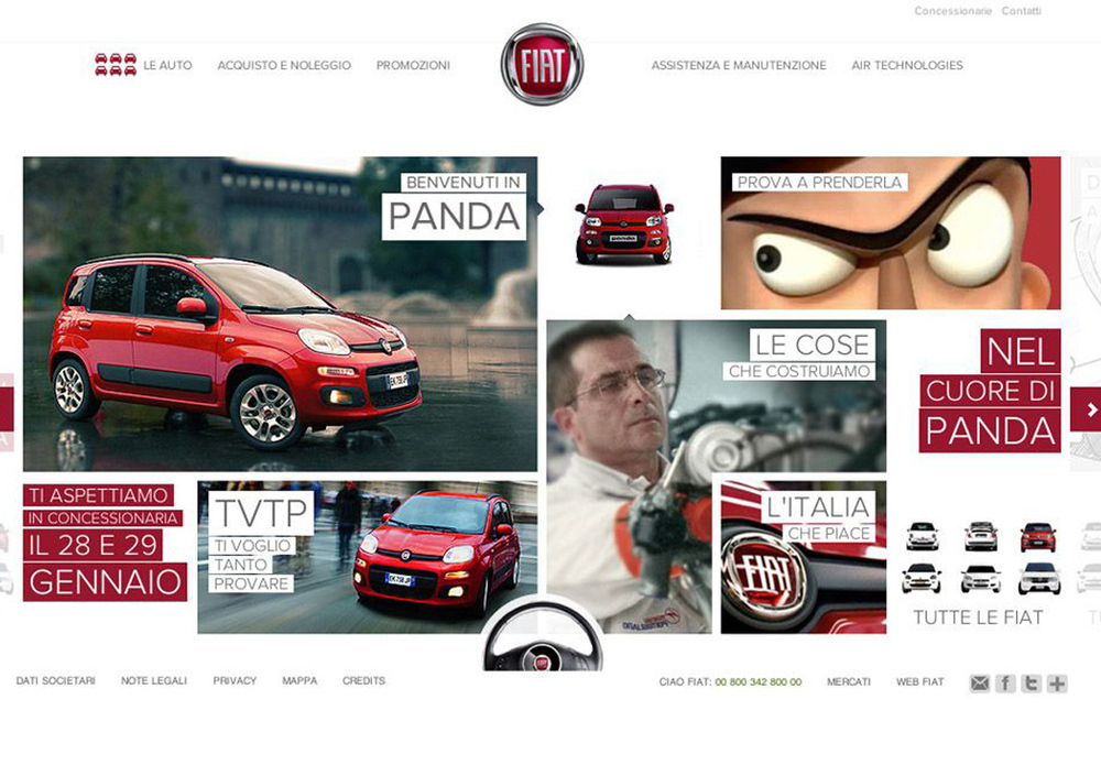 Si rinnova il portale internet del marchio Fiat – www.fiat.it – ora caratterizzato da una inedita grafica e da una nuova gestione dei contenuti. La pagina internet del brand del Lingotto presenta ora tre home page strutturate come una rivista ed un volante al centro del video che, al passaggio del mouse, “gira” a destra e a sinistra, permettendo al visitatore di viaggiare tra le varie pagine.