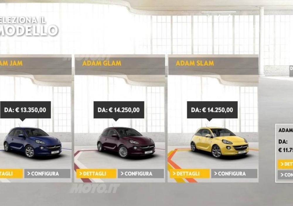 Mancherebbe solo l'adesivo di Automoto.it sulla carrozzeria! E' questo il primo pensiero che ci attraversa la mente osservando l'Opel Adam da noi realizzata con il configuratore (on line dalla giornata di ieri, dopo la presentazione italiana all’edizione 2012 del Motor Show) dedicato alla due volumi della Casa di Rüsselsheim, che permette di scegliere tra 30.000 personalizzazioni proposte all’interno di tre allestimenti (“personalità”, come le definiscono in Opel), e che viene offerta al pubblico a partire da 11.750 euro.
