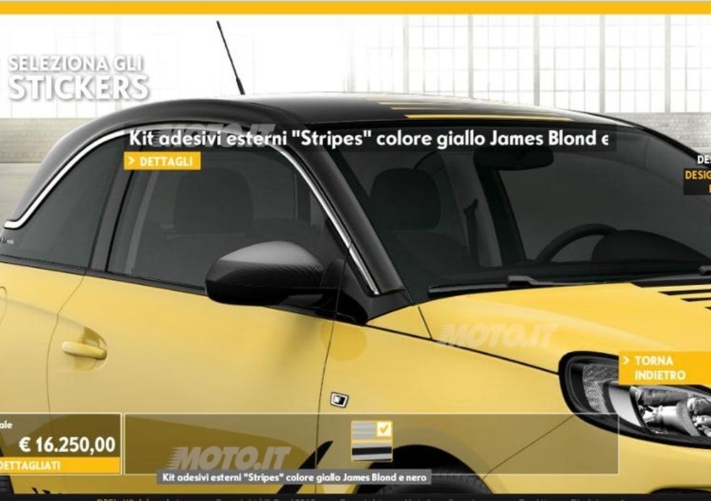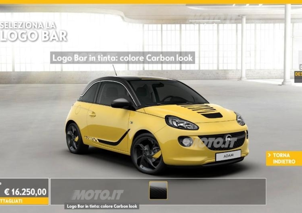 Ci siamo quindi divertiti a configurare la nostra Adam con i colori istituzionali di Automoto.it (giallo e nero) onde verificare la bontà di funzionamento del configuratore on line, che permette di realizzare la due volumi tedesca come meglio si crede a seconda delle proprie esigenze.