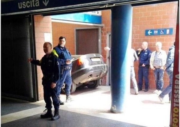 Sono quelle di accesso anche ai parcheggi della fermata Eur-Magliana di Roma, vero, ma accesso pedonale, non con le ruote. Nessun danno alle persone, ma intanto la Skoda Octavia con a bordo il 70enne al volante e una 72enne passeggera, è scesa con le ruote dai gradini, invece di parcheggiare.