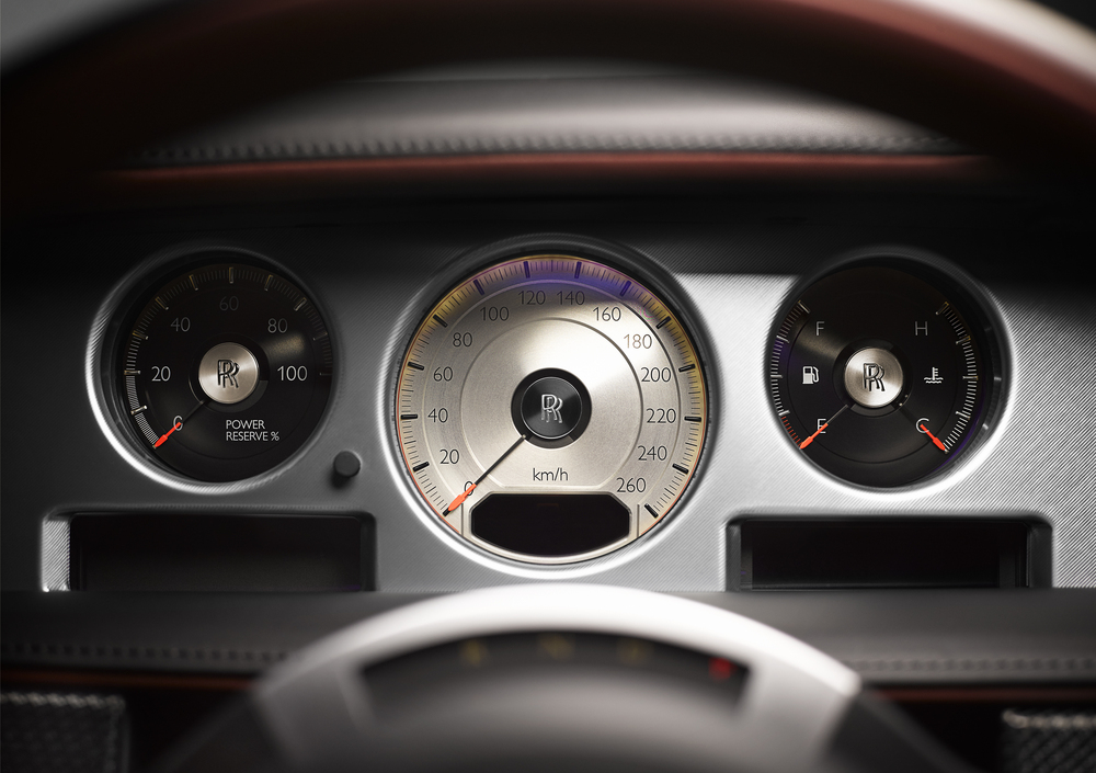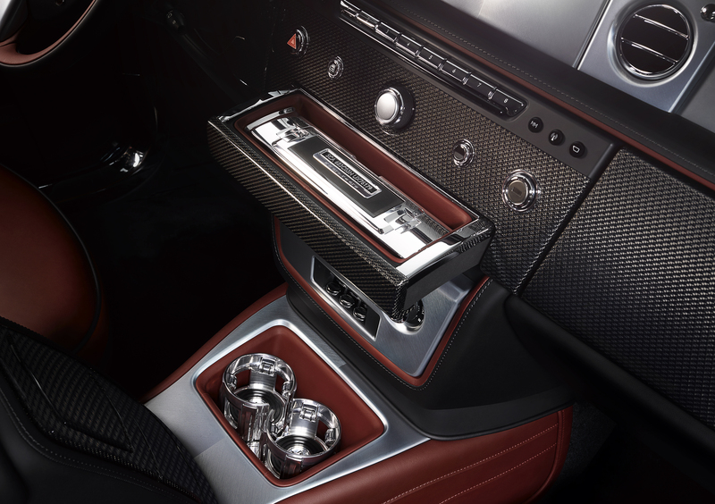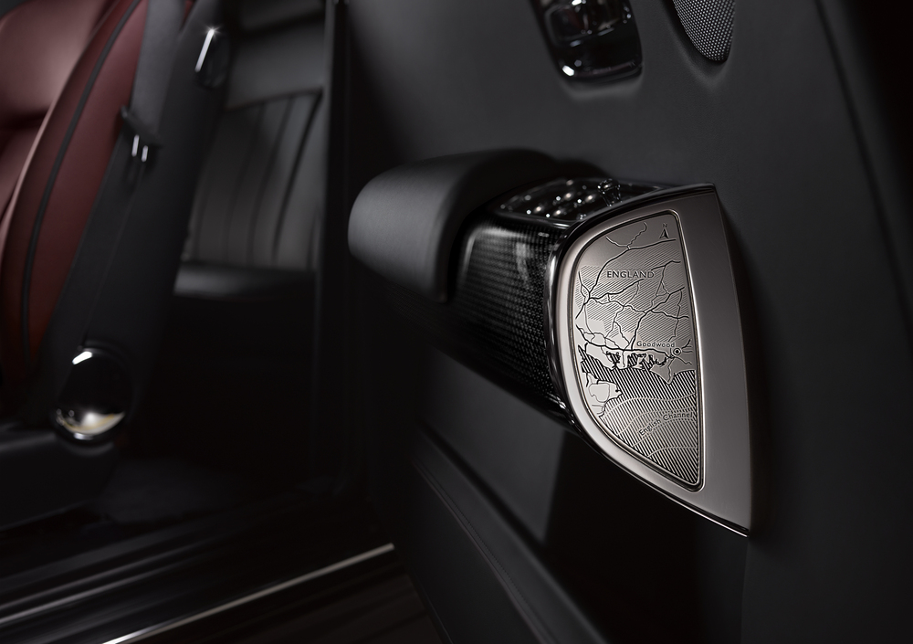 All'interno dell'abitacolo si ritrova tutta l'esclusività che contraddistingue il mondo Rolls Royce, portata qui alla sua massima espressione. Parliamo di "chicche" quali la finitura laser della parte finale dei braccioli, disegnati per richiamare i laghi di Como e Ginevra, dove sono stati presentati i prototipi che hanno anticipato questa versione definitiva. Passando alla console centrale, un cassetto contiene un elemento di alluminio caratterizzato da un'incisione al laser che riporta il numero di telaio e le coordinate geografiche della linea di assemblaggio. Ulteriori particolari di eleganza e raffinatezza sono il contachilometri analogico con rifinitura in alluminio spazzolato e il rivestimento degli interni con pelli di diversi toni a seconda dell'ambiente, uno più scuro per la zona posteriore e uno più chiaro per la zona anteriore, mentre l'ormai classico "cielo stellato" dell'abitacolo è stato ulteriormente affinato per renderlo sfumato verso il posteriore.