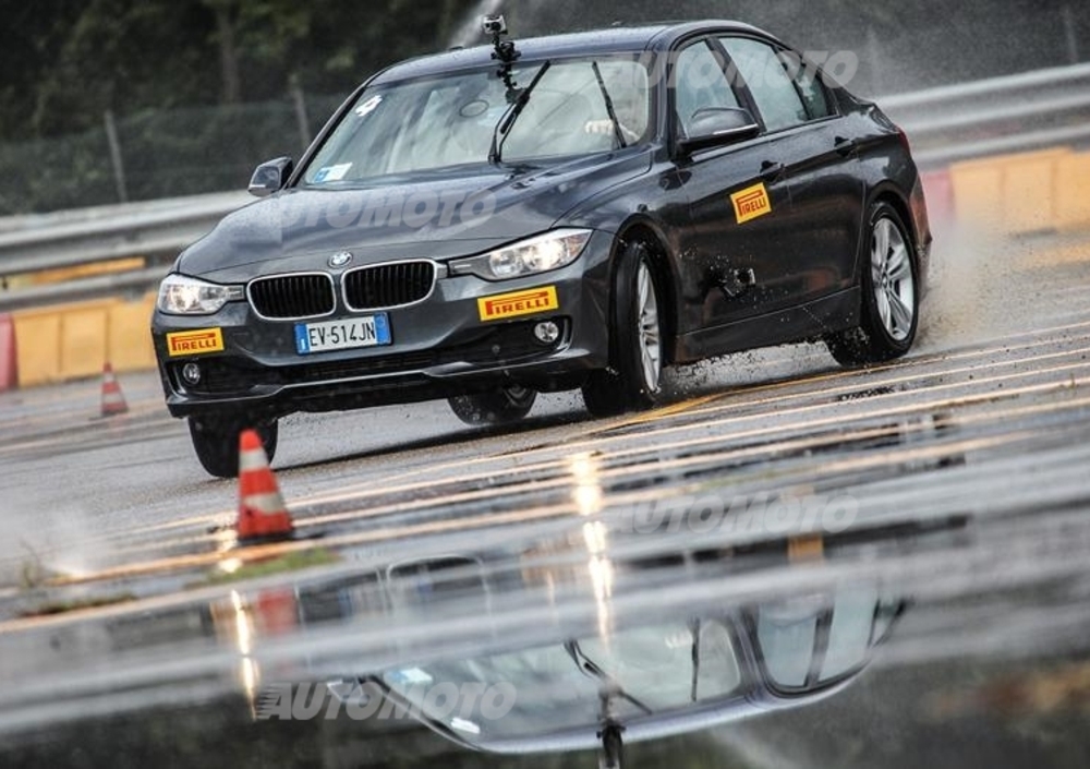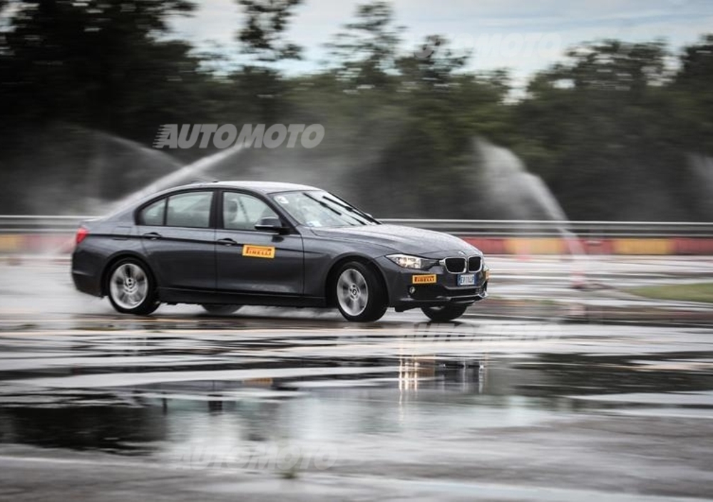 Ad attenderci sull’anello della pista Pirelli ci sono due BMW Serie 3 che montano pneumatici Pirelli P Zero. Due vetture identiche, gomme identiche. Ma, la prima che guideremo, ha sull’asse posteriore due coperture usurate. Questo per simulare la sostituzione delle gomme su un solo asse, procedura molto in voga tra gli automobilisti. Tolti tutti i controlli elettronici entriamo in pista e cominciamo a girare sul ring bagnato, alzando il ritmo di giro in giro. Controllare il posteriore con gomme usurate diventa difficoltoso anche alle basse velocità (già a 50 km/h si avvertono i primi scivolamenti). Quando la velocità si fa più intensa un inevitabile testacoda ci consiglia di “rientrare ai box” e ripetere il test con la vettura dotata di tutte e quattro le coperture nuove e in buono stato. Qui, anche forzando il ritmo, il posteriore resta ben incollato all’asfalto e la BMW non mostra incertezze, anche a velocità sostenute.