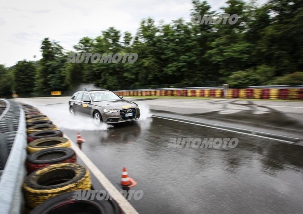 Quarto e ultimo test. Quarta vettura, una Audi A6, equipaggiata con Pirelli P Zero usurati, con battistrada residuo di 2,5 mm. Percorriamo la curva a velocità costante di 60 km/h, oltrepassando una “vasca” lunga 20 metri con 7 mm di acqua. Non si avvertono fenomeni di aquaplaning. Ripetendo la curva a 70 e poi a 80 km/h, invece, la tendenza dell’auto e non mantenere la traiettoria si fa importante. La stessa Audi, equipaggiata con Pirelli P Zero in buone condizioni, ci ha permesso di ripetere la curva a 70, 80 e 90 km/h (quindi 10 km/h in più), prima di avvertire l’indesiderato fenomeno.