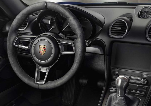 La livrea scelta per l'esemplare di Porsche 718 Spyder firmato Porsche Exlcusive Manufaktur è di colore blu. I cerchi in lega, in tinta nera, presentano un logo centrale colorato. Quanto alla firma luminosa, i fari anteriori presentano una finitura brunita, mentre quelli posteriori sono trasparenti.