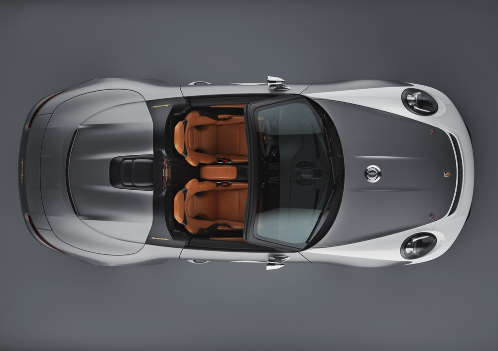 Come vi abbiamo accennato sopra, il parabrezza è più inclinato rispetto ai modelli di 911 in produzione e la parte posteriore è stata completamente ridisegnata: design pulito con la doppia gobba dietro ai poggiatesta dei sedili. C’è anche un flap aerodinamico e un deflettore in plexiglas trasparente con il logo dei 70 anni della Casa. Per richiamare i modelli passati, manca totalmente un soft top: l’unico modo per proteggere l’auto dalla pioggia (quando è parcheggiata) è installare un’apposita copertura di tela fissata tramite otto fermi Tenax. Gli amanti del dettaglio avranno notato il cofano in fibra di carbonio che accoglie il tappo per fare rifornimento di benzina. E per concludere, guardate le foto nella gallery qui sotto: stupenda la colorazione in grigio con il paraurti anteriore bianco, la scritta Porsche con il n° 70 sulle portiere e la firma Speedster in oro tra i due fari dietro.