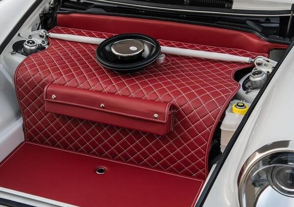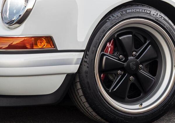 Le ruote sono dotate invece dei classici cerchi Fuchs in nero con dadi e prigioneri aperti, mentre le pinze dei freni sono rifinite in Singer Racing Red con scritte bianche.