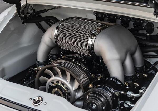 In questa 911 speciale, il flat-six da 4.0 litri raffreddato ad aria è stato impreziosito da una finitura in ceramica ed è accoppiato con una trasmissione AWD e cambio a sei velocità. Il vano motore è presentato in tinta con la carrozzeria.