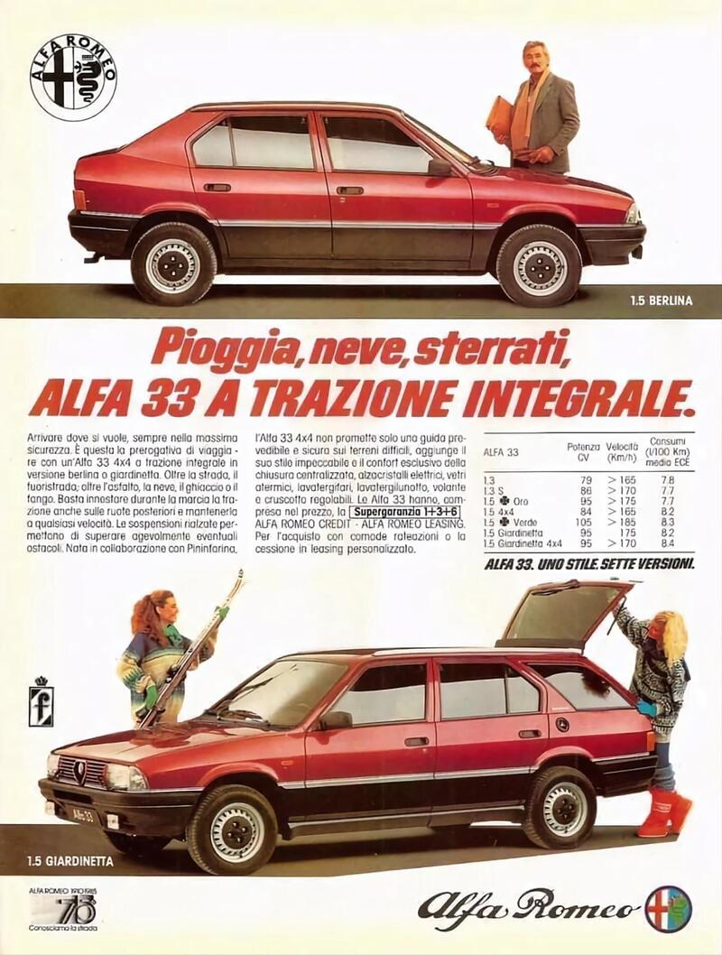 E poi anche la abbastanza diffusa versione giardinetta, oggi wagon. Erano sette le versioni di Alfa 33 disponibili, con la 1.5 che rappresentava il top per potenza: fino a 105CV.