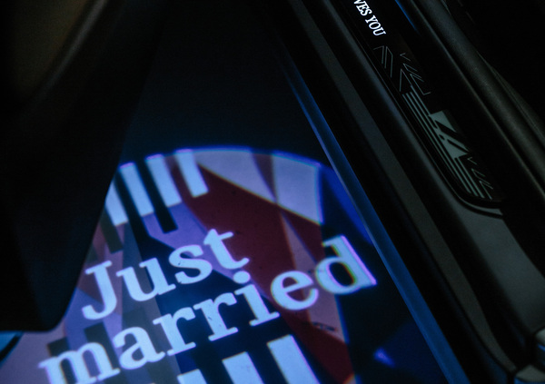 Decisamente suggestiva è la verniciatura del tetto: realizzata a mano, unisce elementi delle bandiere britannica e americana, a ricordo della nazionalità degli sposi. I badge bianchi sopra gli indicatori di direzione presentano le iniziali M e H separate da un cuore; questo dettaglio è stato realizzato con stampa 3D. Romantico il messaggio proiettato sull'asfalto quando si sbloccano le portiere: "Just Married".