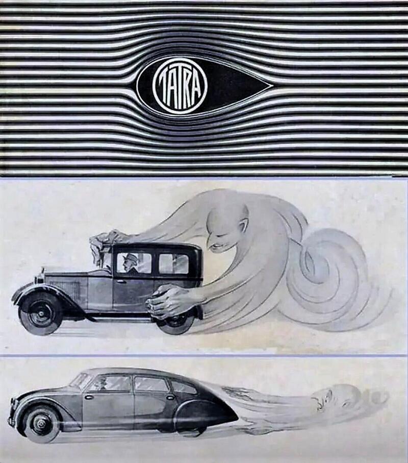 Le vetture Tatra, di lontana origine ceca, venivano pubblicizzate anche con questa raffigurazione nel periodo tra le due guerre mondiali, anni Trenta.