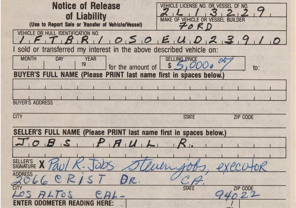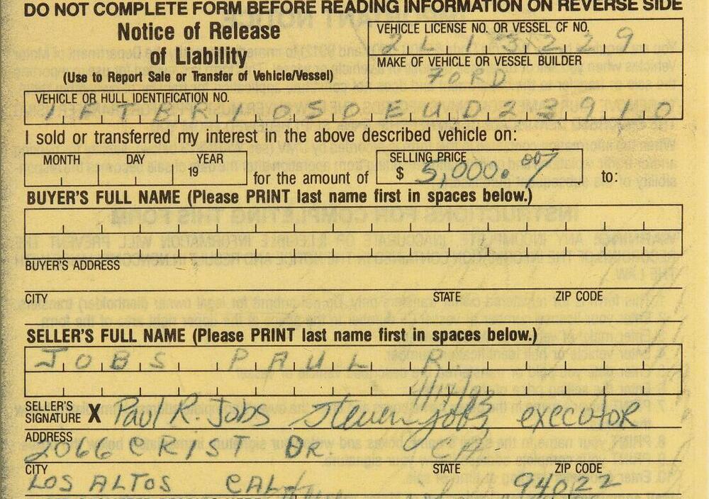 Il fondatore della Apple compilò quel foglio in qualità di esecutore testamentario dell'eredità paterna, autorizzando la vendita dell'automobile appartenuta a Paul Reinhold Jobs. Di suo pugno scrisse il nome del padre, il prezzo di cessione di 5.000 dollari e la propria qualifica di "executor". Il resto del documento, compresi i dati del veicolo e l'indirizzo della leggendaria casa di famiglia a Los Altos, fu completato da un'altra mano.