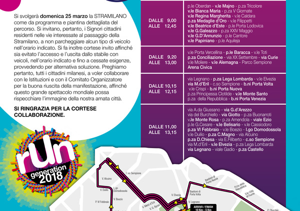 Nella giornata di domenica 25 marzo, in occasione della Stramilano 2018, numerose strade verranno chiuse e ci sarà ildivieto di circolazione a seconda degliorari. Come riporta la locandina dell’evento: «I Signori cittadini residenti nelle vie interessate al passaggio della Stramilano, a non parcheggiare alcun tipo di veicolo nell’orario indicato. Si fa inoltre cortese invito affinché sia evitato l’accesso e l’uscita dallo stabile con veicoli, nell’orario indicato e fino a cessate esigenze, provvedendo per alternativa soluzione». Qui sotto vi riportiamo tutte le limitazioni per il traffico di Milano, nella gallery trovate anche la locandina con la mappa dei percorsi e le strade chiuse.