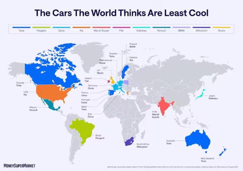 Curiosamente, Tesla appare sia al 4° posto tra i più cool che al 1° posto tra i meno cool (31%), evidenziando una forte polarizzazione delle opinioni legate probabilmente alla divisiva figura di Elon Musk e al dibattito sulle auto elettriche.