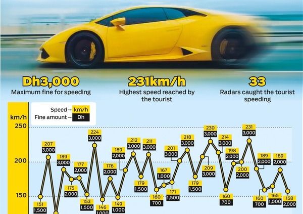 Già perché come riportano i media arabi, un europeo non meglio identificato avrebbe preso la sua bella Huracàn (bei gusti, niente da dire: ci si rilassa e gira bene in città) nella notte accumulando, in meno di quattro ore (dalle 2.30 alle 6.00: tipici momenti in cui si percorre lucidamente una tratta con moglie e figli appresso) ripetuti passaggi record su Sheikh Zayed Road. Una trentina di rilevamenti oltre il consentito, con la top-speed quotata a 231 Km/h. Si può fare di meglio in pista diciamo noi, molto, ma non di peggio in strada, in città.