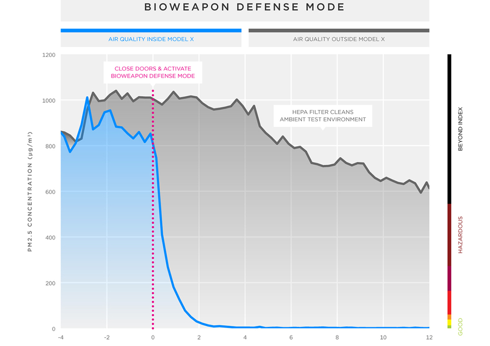 «Il risultato è un sistema di filtraggio che è centinaia di volte più efficiente dei filtri standard, capace di assicurare al guidatore e ai passeggeri una qualità ottimale dell'aria nella cabina indipendentemente da quello che accade nell'ambiente circostante», assicura Tesla Motors, che a supporto delle proprie argomentazioni ha diffuso i risultati dei test, riportati nel grafico seguente, eseguiti in una camera di prova.