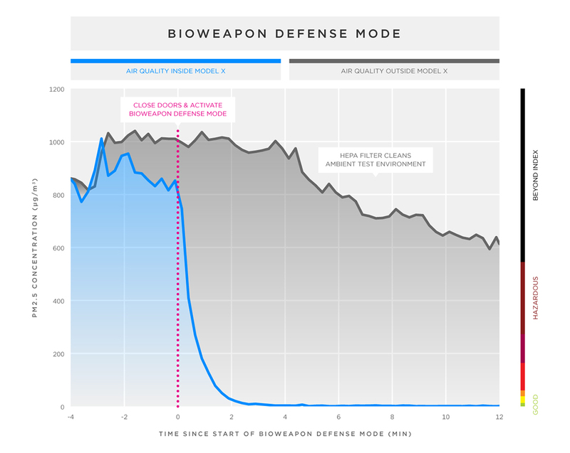 Disponibile sui modelli Model X e Model S, il cosiddetto “Bioweapon Defense Mode”, letteralmente “modalità difesa da armi biologiche”, è un climatizzatore ispirato dai sistemi di filtraggio dell'aria utilizzati nelle sale operatorie degli ospedali in grado di respingere pollini, batteri, virus, spore e inquinanti in genere purificando continuamente l'aria dell'abitacolo. Sistemi simili sono utilizzati in veicoli speciali, come la Cadillac del presidente degli USA.