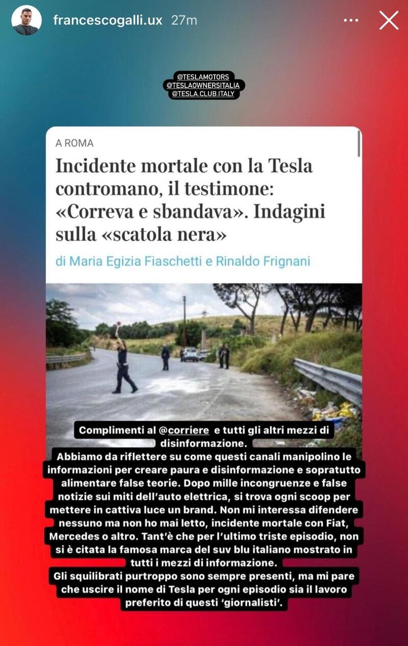 Che l'incidente sia accaduto con una Tesla è un dettaglio che fa parte del dovere/diritto di cronaca, usare questo dettaglio come un'accusa di partigianeria è stupido e falso, e distrae dal vero problema: non può e non deve passare inosservato che questo episodio è l'ultimo di un tragico precipitare della situazione che porterà - come già accaduto - ad un inasprimento delle pene senza una reale possibilità di prevenzione e controllo su pazzesche sfide social portate al limite per un "mi piace" da guidatori incapaci e irresponsabili.