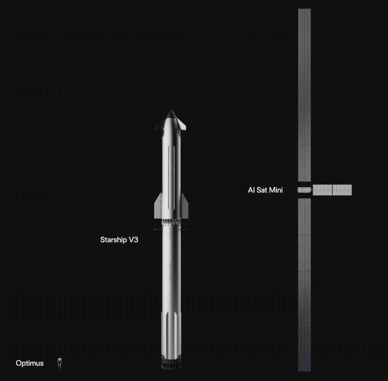Musk ha mostrato durante l'evento un render del satellite ottimizzato per l'intelligenza artificiale, basato sul design di Starlink ma profondamente ripensato. L'enorme fabbisogno energetico porterà questi satelliti a dispiegare pannelli solari lunghi fino a 150 metri, capaci di generare circa 100 kilowatt ciascuno. Per il lancio sarà indispensabile un utilizzo massiccio di Starship, tanto nella versione V3 ancora in attesa di debutto quanto nelle sue evoluzioni successive.