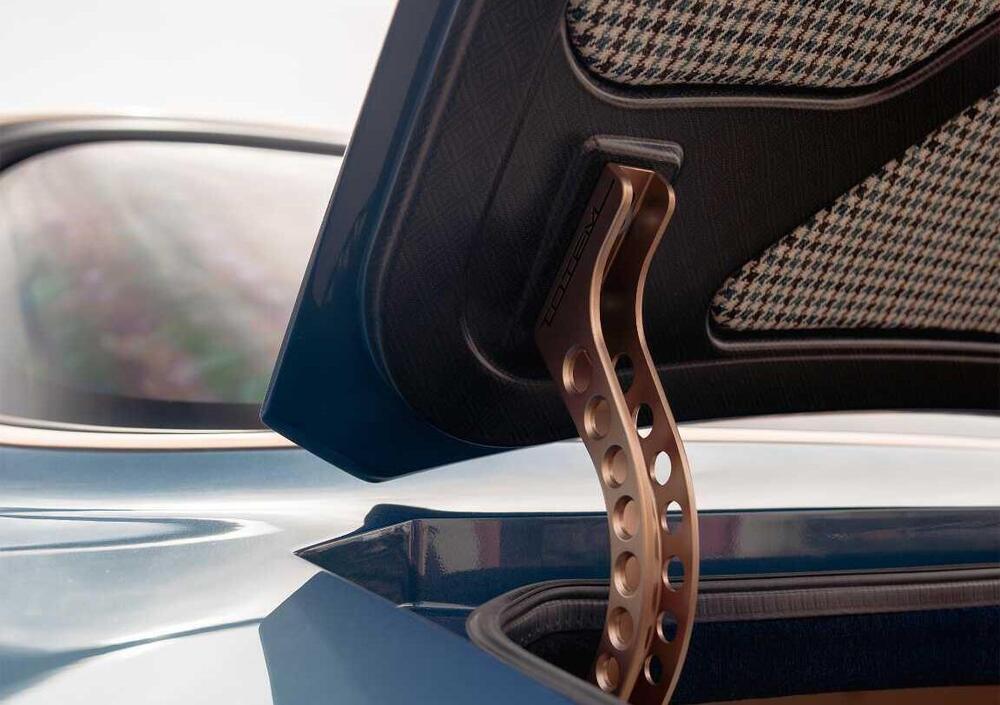 La tinta esterna è una variante di "Azzurro Pervinca" sviluppata appositamente per questa vettura: una verniciatura metallizzata a triplo strato realizzata a mano, scelta per richiamare i toni delle coste della California. Il trim in oro satinato percorre sia l'esterno che l'abitacolo, mentre i componenti in fibra di carbonio con finitura opaca e trama romboidale - elemento distintivo della produzione Totem - completano la configurazione esterna.