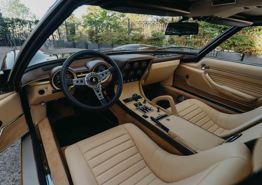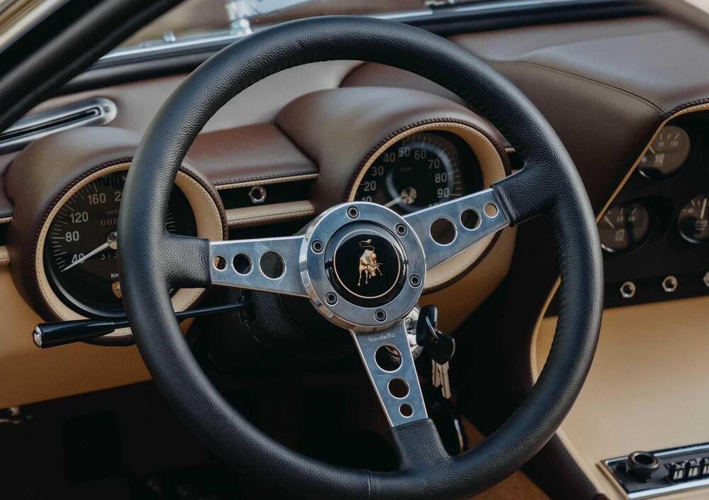 Aperta la portiera, la magia continua. L'interno è stato ricostruito con una pelle color Senape, un tan caldo che Lamborghini ha dovuto nuovamente ripescare dai propri archivi, perché quella specifica gradazione del 1972 si era evoluta negli anni successivi, adattandosi a modelli diversi e perdendo la sua identità originaria. Il risultato è un ambiente che sa di sigari accesi in una villa padana, di autostrade italiane percorse senza limiti, di un'epoca in cui il lusso si misurava nella qualità del cuoio e non nei pollici di un display.