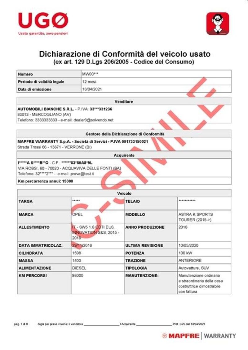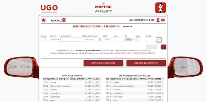 L’esperienza ventennale in Italia, con gestione di oltre 3 milioni di veicoli, permette a Mapfre questa soluzione innovativa nel mondo dell’usato. Il sistema UGØ supporta il venditore in modo trasparente, verso l’utente finale, generando il cosiddetto Coefficiente di Pregresso Utilizzo del veicolo, CPU. Questo parametro deriva dall’analisi imparziale di nove sottosistemi dell’auto, su dati certi. In seguito ai possibili interventi di ripristino, arriva poi la dichiarazione di conformità, a tutela del consumatore secondo Codice del Consumo. I