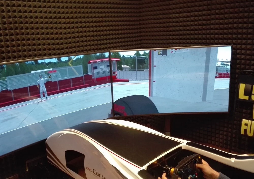 L’impianto video è costituito da uno schermo a superficie curva, dalle dimensioni personalizzabili, e con proiettori full HD professionali e con fino a tre dispositivi per schermo, mente l’impianto audio è un home theatre professionale Bose 5.1: la combinazione dei supporti audio, video e informatici della Sim Speed Room consentono di ottenere il massimo grado di immersività e realismo nella guida su pista.