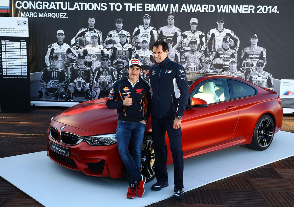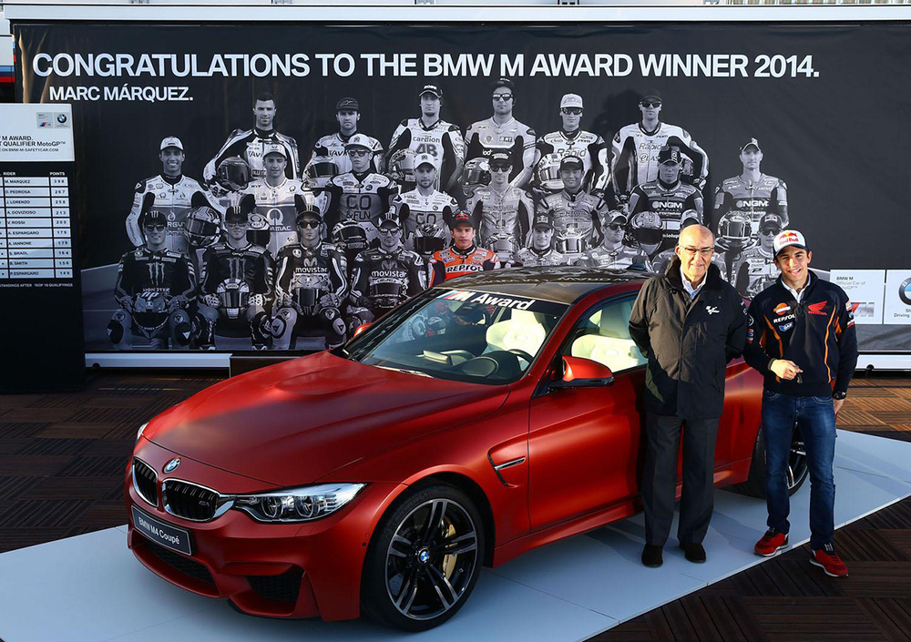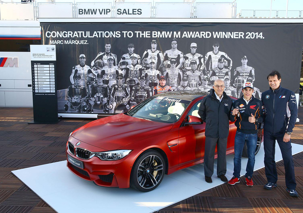 Anche quest'anno BMW ha premiato il migliore pilota in qualifica della MotoGP con una esclusiva supercar. Il vincitore è sempre lo stesso: il Campione del Mondo Marc Marquez. L'anno scorso aveva ricevuto una M6, mentre quest'anno gli uomini dell'Elica lo hanno voluto omaggiare con l'ultima arrivata, la M4 Coupé.