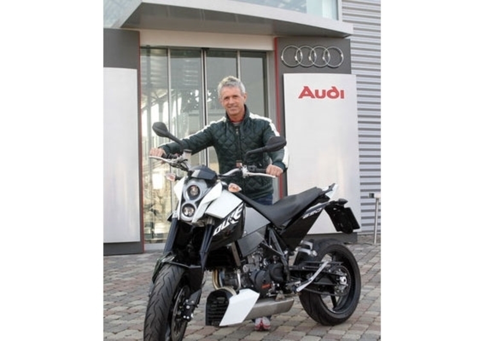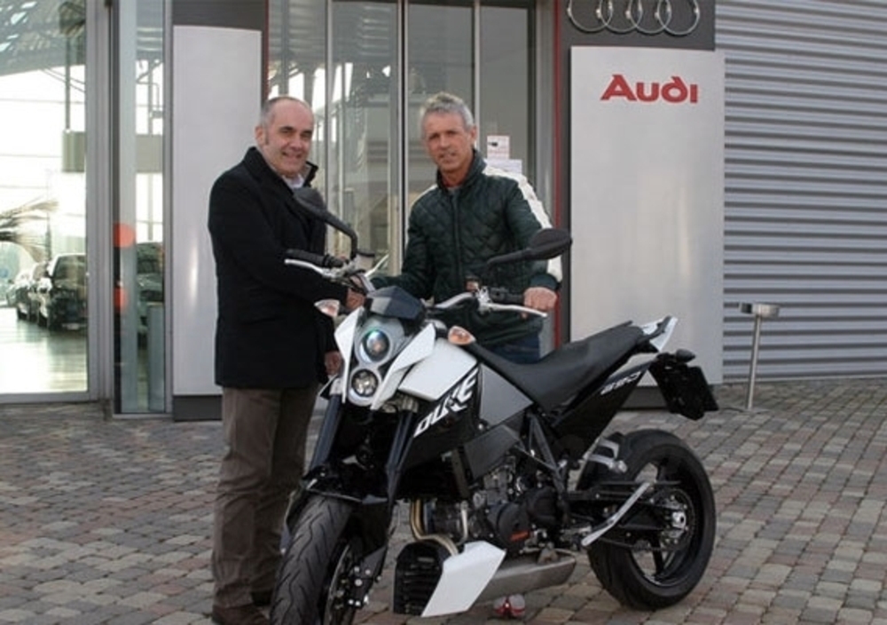 Maestro delle quattro ruote quindi, ma con una passione per le due ruote...tant'è che Dindo ha scelto una KTM 690 Duke per i suoi spostamenti quotidiani e per passare qualche momento di puro divertimento: equipaggiata con il monocilindrico LC4 da 654 cc, la piccola Duke è, oggi come oggi, la più potente della categoria...oltre che essere forse la più innovativa in termini di design, elemento che sembra aver colpito il mitico pilota italiano oltre che migliaia di clienti in tutta Europa.