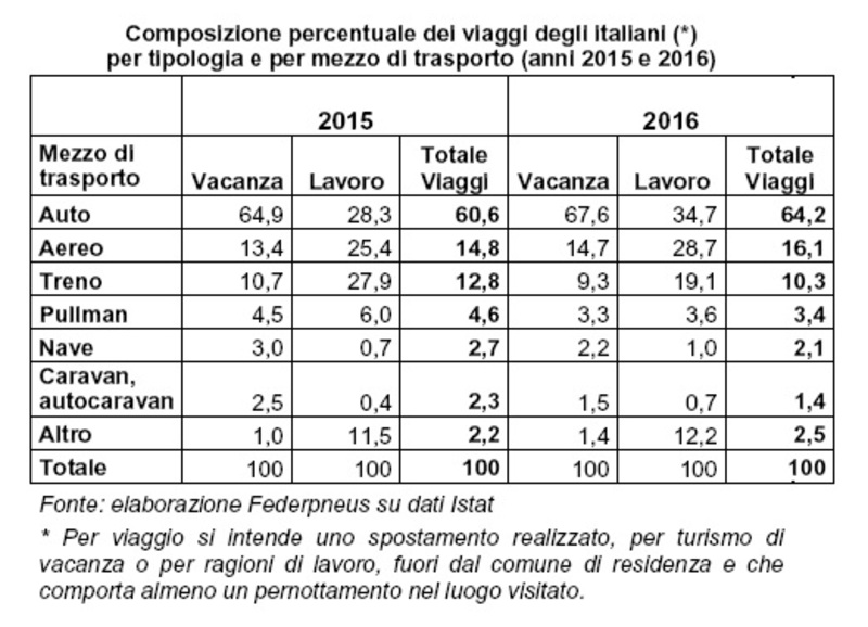 L’automobile resta il mezzo preferito dagli italiani per i propri viaggi, per vacanza o per lavoro, intendendo per viaggio uno spostamento che comporta almeno un pernottamento fuori casa. Nel 2016 la percentuale di viaggi per i quali è stata scelta l’auto come mezzo di trasporto è stata del 64,2%. I dati derivano da un’elaborazione di Federpneus (Associazione Nazionale dei Rivenditori Specialisti di Pneumatici) su fonte Istat.