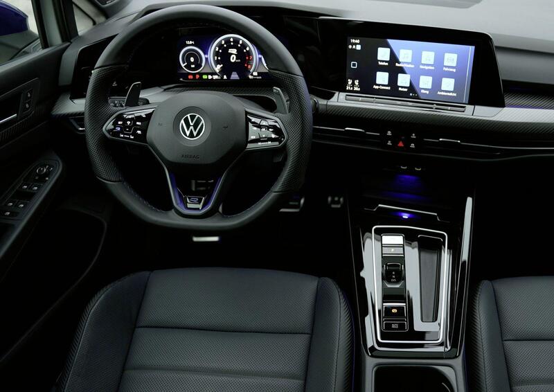 In abitacolo, la VW Golf R 20 years, ha inserti in carbonio selleria sportiva in pelle e volante a comandi touch. Il Cockpit Pro e il Navigatore Discover Media sono da 10,25".
