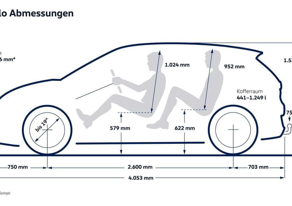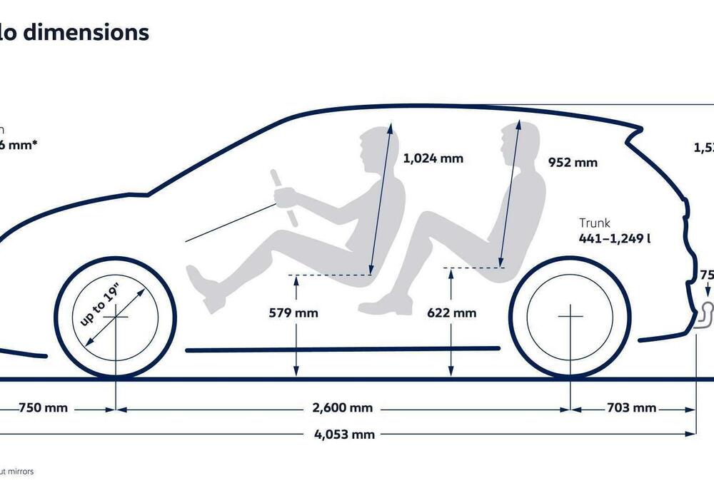 Le dimensioni sono 4.053 mm di lunghezza, 1.816 mm di larghezza, 1.530 mm di altezza e 2.600 mm di passo. Per confronto, la Polo basata sulla piattaforma MQB misura 4.074 mm di lunghezza ma solo 1.751 mm di larghezza e 1.451 mm di altezza. L'ID. Polo è quindi più larga, più alta e con un passo più lungo, pur essendo leggermente più corta. I cerchi arrivano fino a 19 pollici, con passaruota sporgenti e carreggiata da 1.526 mm che rafforzano ulteriormente la sensazione di stabilità.