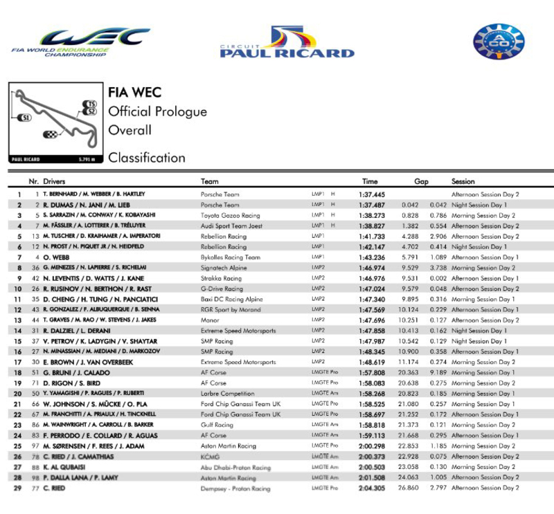 Porsche sugli scudi nel prologo della stagione 2016 del World Endurance Championship, in programma ieri e oggi in Francia, al Circuit Paul Ricard. A cogliere il giro più veloce della due giorni di test è stato il pilota neozelandese Brendon Hartley, che nella mattinata di oggi ha ottenuto il crono di 1'37"44. In cima alla classifica combinata dei risultati di venerdì e sabato, troviamo quindi la Porsche 919 Hybrid n.1 dei campioni del mondo WEC in carica, Mark Webber, Brendon Hartley e Timo Bernhard. Segue l'altro equipaggio della casa di Zuffenhausen, formato da Romain Dumas, Neel Jani e Marc Lieb, grazie ad un crono colto nella sessione notturna di venerdì.