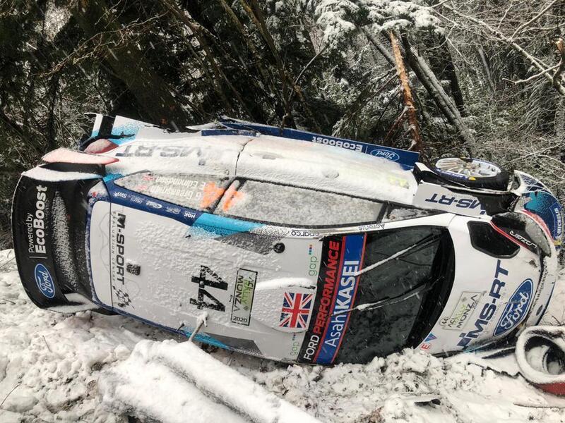 Quello di Selvino, tra neve e ghiaccio, ha visto l’auto di Gus Greensmith, una Ford, finire capottata nei boschi dopo aver demolito il guard-rail.