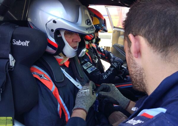 Michel Nandan, il “Boss” assoluto, ci spiega cos’è l’”ordigno” su cui stiamo per salire. È la versione “intermedia” della i20 Coupé. Chassis, sospensioni, meccanica, “aero” è Plus, solo il motore è la versione pre-WRC+. Io direi 70, 80 cavalli meno dell’ultima versione dell’Astronave ufficiale. Peccato, non potremo confrontare i “nostri” tempi con quelli di Neuville che ha vinto entrambe le esecuzioni della Cala Flumini, e da lì “steso” il Rally all’ultima ripresa. Ci infiliamo tra i tubi della “gabbia” di protezione, prendiamo posto. Abbiamo anche un Meccanico che si occupa di noi, ci regola sedile e cinture, collega l’interfono.