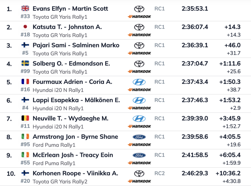 Quattro Toyota ai primi quattro posti. Si può dire e sintetizzare con una sola osservazione: Evans è stato perfetto, perfettamente bilanciato tra velocità, tattica e attenzione. Sembrerebbe un segno di consapevolezza importante. Rispetto al sabato non è cambiato nulla, di fatto, la classifica è congelata da allora. Neanche il minuto di penalità comminato a Neuville per non avere, come consiglia Cereghini da sempre, allacciato bene il casco, smuove le posizioni dei primi dieci. Per trovare un altro bagliore luminoso dal Nord Europa bisogna andare più indietro, ma non troppo e sempre meno: Matto Fontana ha guadagnato una posizione e ora è sedicesimo assoluto, con la Ford Rally3! Roope Korhonen e Anssi Viinikka, Yaris Rally2, decimi assoluti alle spalle anche di Armstrong e McErlean, vincono il WRC2.