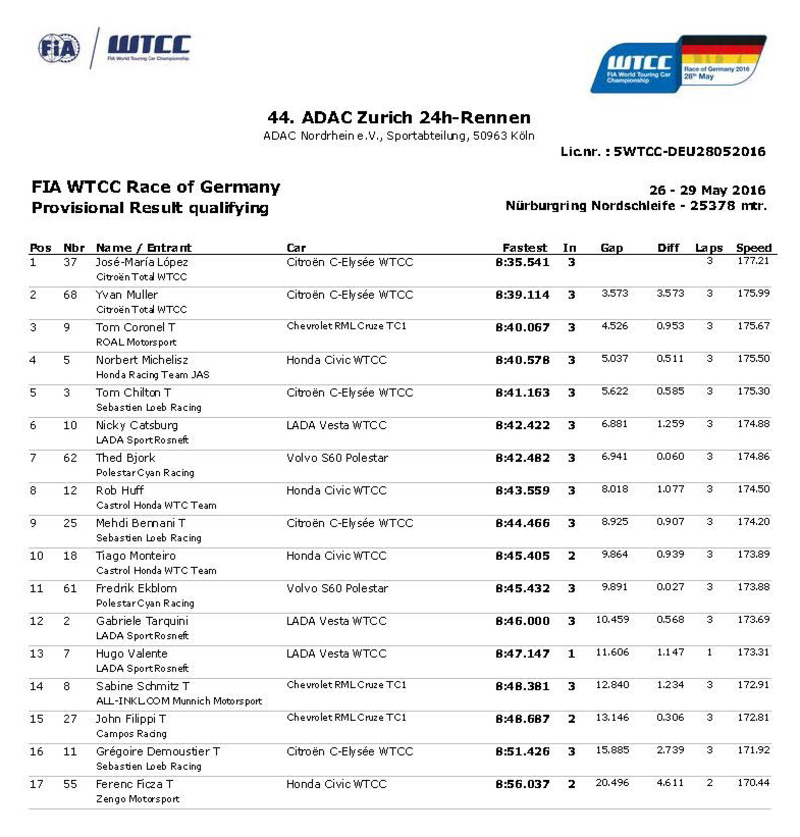 Sorprende Tom Coronel: l’alfiere della ROAL Motorsport ama particolarmente il Nordschleife, e si vede. L’olandese ha colto il terzo tempo nelle qualifiche al volante della sua Chevrolet Cruze. Il più veloce dei piloti Honda è stato l’ungherese Norbert Michelisz, quarto sulla sua Civic. Buona prestazione, quella di Tom Chilton: l’alfiere della Sébastien Loeb Racing scatterà dalla quinta piazzola in griglia nella Main Race al volante della sua Citroen C-Elysée.