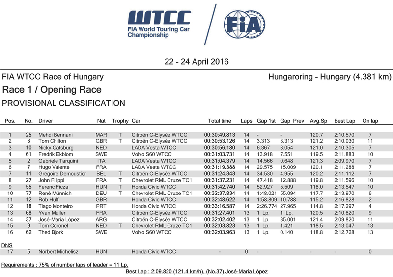 Vittoria per Mehdi Bennani nella Opening Race all'Hungaroring: il pilota marocchino, al volante della Citroen C-Elysée preparata dal team Sébastien Loeb Racing, coglie la prima vittoria della stagione 2016 e consolida la sua leadership nel Trofeo WTCC riservato alle vetture private. La gara è stata disputata su pista bagnata a causa delle precipitazioni che hanno interessato l'Hungaroring nella giornata di oggi. Il WTCC è stata la prima categoria FIA a sperimentare il nuovo manto di asfalto del circuito magiaro, messo a nuovo per la stagione 2016.