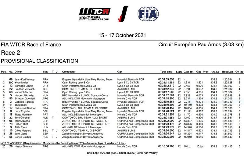 Al termine di una gara 2 spettacolare Jean-Karl-Vernay torna alla vittoria. Il pilota della Englster-Hyundai, si è aggiudicato la race 2 del Gran Premio di Francia 2021 di WTCR, precedendo Yvan Muller e Santiago Urrutia.