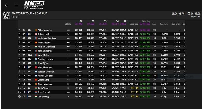 Completano la top ten Santiago Urrutia, Thed Bjord e Mehdi Bennani che ha recuperato sei posizioni rispetto alle qualifiche. Vanno in zona punti anche Esteban Guerrieri e Nestor Girolami soltanto undicesimo e dodicesimo, davanti a Qinghua Ma e Tiago Monteiro. Ritirati Attila Tassi, Tom Coronel, Daniel Nagy.