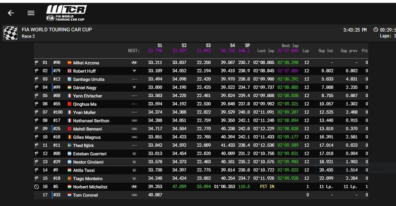 Sul gradino più basso del podio Santiago Urrutia autore di un grande miglioramento rispetto a gara 1, alle sue spalle Nagy che è riuscito a difendersi da Yann Ehrlacher transitando sotto la bandiera a scacchi quarto. Dietro al campione del mondo Qinghua Ma che non è riuscito a sfruttare la pole per la griglia rovesciata, perdendo sei posizioni, e Yvan Muller.