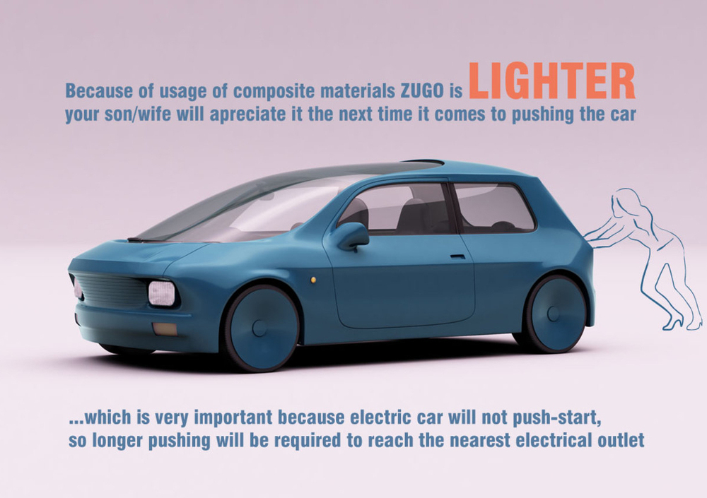 La Zugo immaginata dal disegnatore è prima di tutto una vettura elettrica, che si propone di abbattere le emissioni nocive nella grandi città congestionate dal traffico, ma vuole essere anche un’auto low cost, facile ed economica da mantenere e da riparare.
