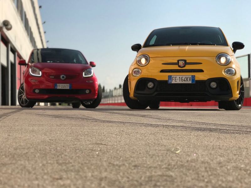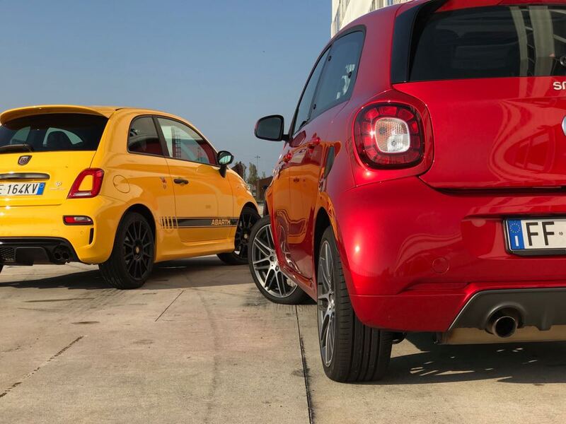 Le abbiamo portate entrambe in pista, oltre che in strada, essendo piccole da città con un taglio molto sportivo. La Abarth è ovviamente la più pretenziosa per sportività, non solo esibita. Sotto il cofano il 1.4 turbo quattro cilindri ha una buona dose di cavalleria in più, rispetto la rivale pur curata nella variante Brabus: quasi 70 CV. Con l’evoluzione sportiva della piccola di casa Fiat si arriva ben più in fretta a elevate velocità rispetto a Smart: più ripresa, accelerazione e doti velocistiche in assoluto. In circuito la 595 beneficia molto di taratura sospensioni e impianto freni, dando sostanzialmente una sonora “paga” alla Smart Brabus. I toni dello scarico poi sono molto più elevati e pieni, per l’italiana che sa divenire esaltando, per chi apprezzi il genere, contrariamente alla quasi pacata (confronto a 595 Abarth, ovviamente) Brabus. Il manuale a cinque rapporti della 595 offre sensazioni ben più fisiche e vicine al passato, guidandola e bene anche su pista. La Smart Forfour Brabus è invece molto più moderna automobilisticamente, anche in termini di feeling. Il suo motore tre cilindri condiviso con Renault ha un’erogazione meno cattiva ma anche meno “rustica” per come salgano i giri e la potenza, qui meno presente agli alti. La percezione guida Smart è ben diversa già per il cambio, qui a sei rapporti con doppia frizione (DNA tricolore, ndr) non certo impegnativo quando su 595, per piede sinistro e mano destra. Per usi cittadini indubbiamente Smart Forfour è più amica, flessibile e dotata di qualche comodità come la retrocamera. Il suo passo ruota maggiore, a quota 2.50 metri, non la avvantaggia nelle ”esse” da circuito ma le consente, unito al resto di cui dotata, una migliore rilassatezza in viaggio. Il gap su un giro a pieno gas in pista, dal crono compreso tra 1.40 e 1.50 minuti, vede Abarth 595 primeggiare di ben quasi sette secondi sulla rivale. Dato ovvio pensando anche al maggior peso della tedesca. In uso cittadino invece i ruoli si invertono, causa la netta rigidità della 595 che comporta maggiori scuotimenti, rispetto a una Forfour più morbida e dotata di un diametro sterzata ridotto, con trazione posteriore e ruote meno ingombranti. I consumi, a favore dalla Smart Forfour, vedono una differenza dichiarata su ciclo misto di ben 1,8 litri per 100 chilometri.