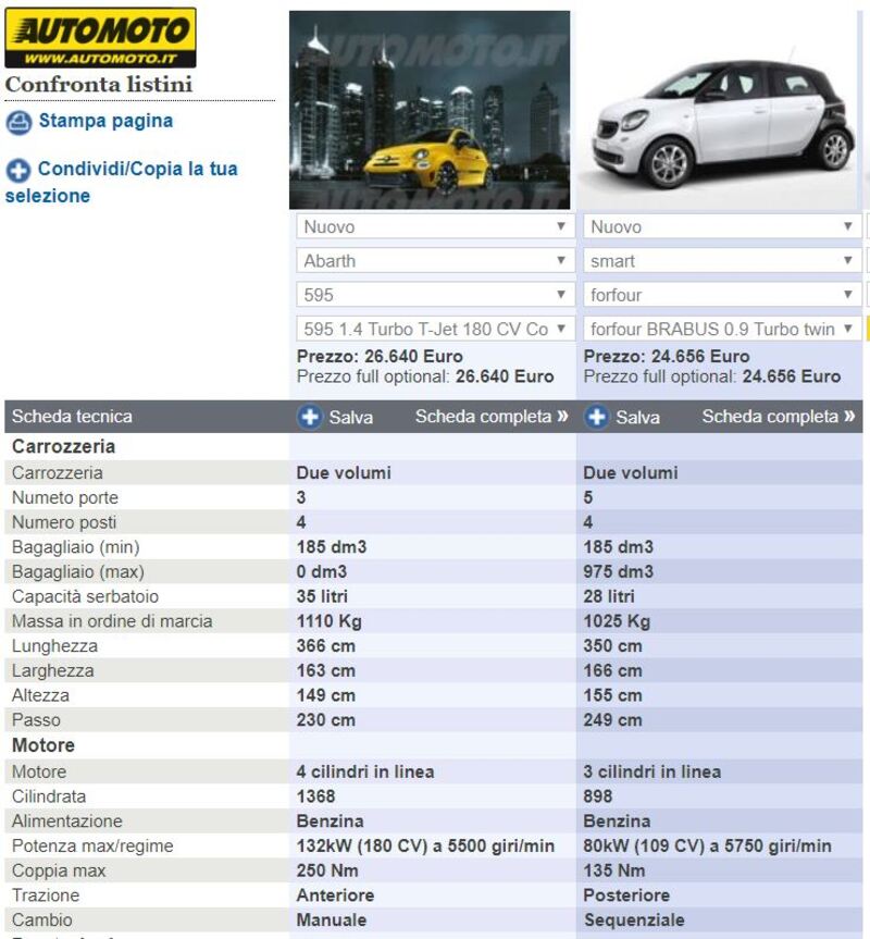 Prezzi simili, ma tecniche e rendimenti distanti. L’italiana è nettamente più divertente da guidare, prestante per andarci in pista, dove vince a mani basse piacendo a molti giovani. La tedesca più vicina invece a chi apprezzi la grinta entro i 3,6 metri senza però rinunciare a tutte le comodità di una guida poco sacrificata. Certo i cavalli e la tecnica che si fa “sentire” oltre che vedere dall’italiana sono tali da porle quasi su nicchie diverse, ma con un must di carico e spazio dietro da fruire, ad esempio in ambito familiare, la Forfour Brabus si posiziona vicina, o meglio dire dietro alla piccola Abarth, superandola poi per piacevolezza in utilizzi urbani e qualche tecnologia utile in viaggio. Emozioni sportive, un po’ spaccone, tricolori Vs. cura prestazionale non a fondo scala per un progetto più ancorato all’efficienza. A questo link le due schede modello affiancate sullo strumento di Confronto Automoto.it.