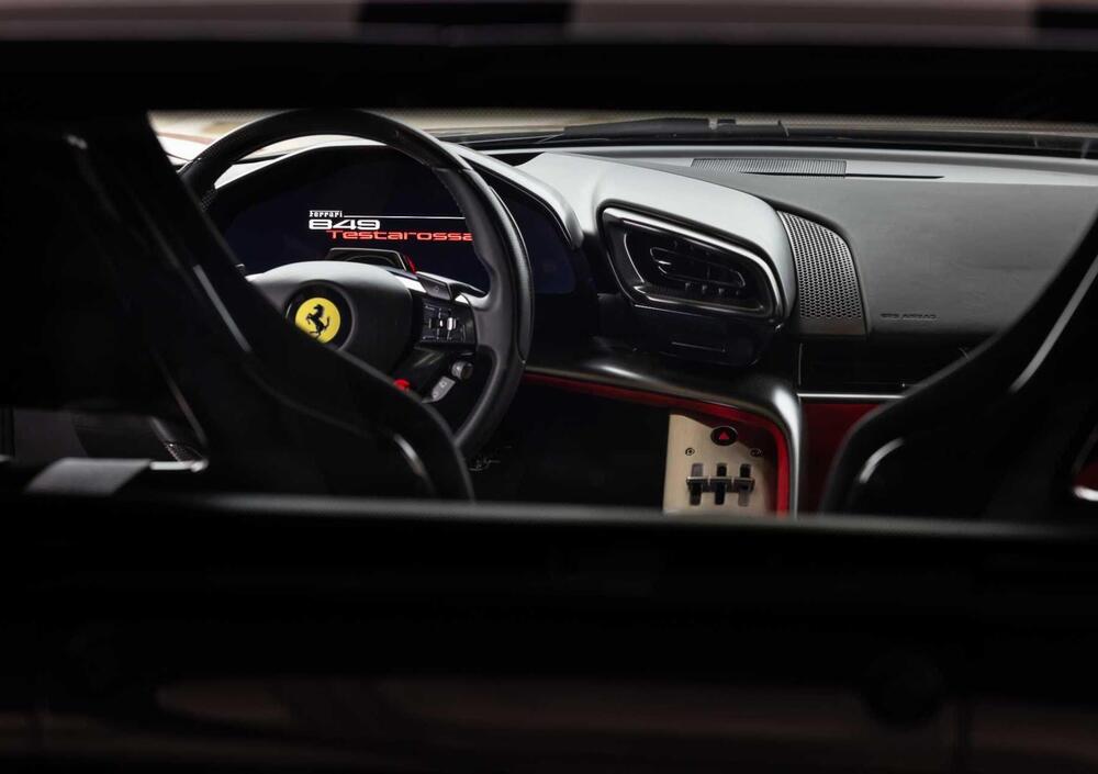 L’abitacolo della 849 Testarossa rappresenta una sintesi perfetta tra l’impostazione da berlinetta con plancia orizzontale e il cockpit da monoposto da competizione. Il corpo superiore della plancia presenta modellati plastici con effetto flottante e bocchette incorniciate da una struttura in alluminio che definiscono un caratteristico tema a “C”. Una fascia orizzontale a contrasto integra i comandi principali e lo schermo per il passeggero.