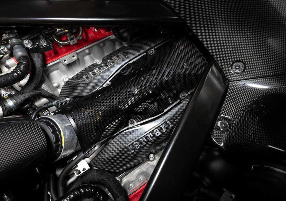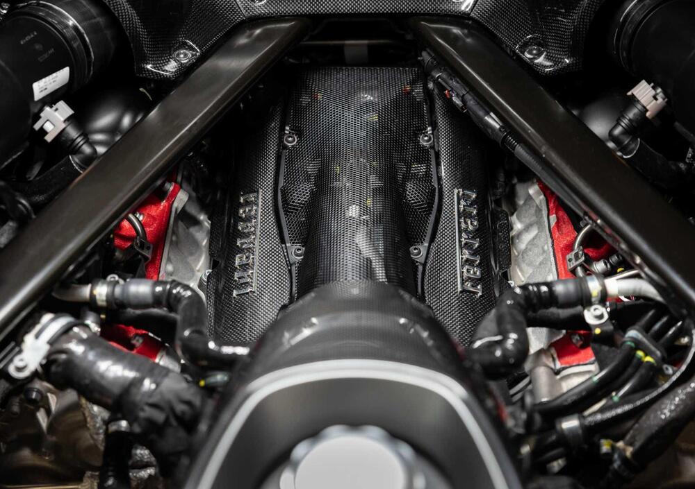 L’incremento di 50 cavalli rispetto alla SF90 Stradale è stato ottenuto attraverso una revisione totale della componentistica. Il turbocompressore è completamente nuovo e dalle dimensioni maggiorate, il più grande mai montato su una Ferrari di gamma, con cuscinetti a basso attrito di derivazione F80 e uno scudo termico sulla cassa turbina ispirato alla 296 GT3. Le ruote di compressore e turbina sono state ottimizzate in termini di materiali e aerodinamica, mentre una strategia di calibrazione affinata minimizza il turbo lag mantenendo la reattività tipica dei motori Ferrari.